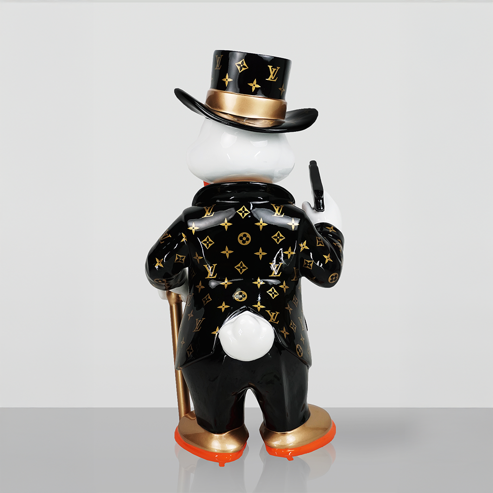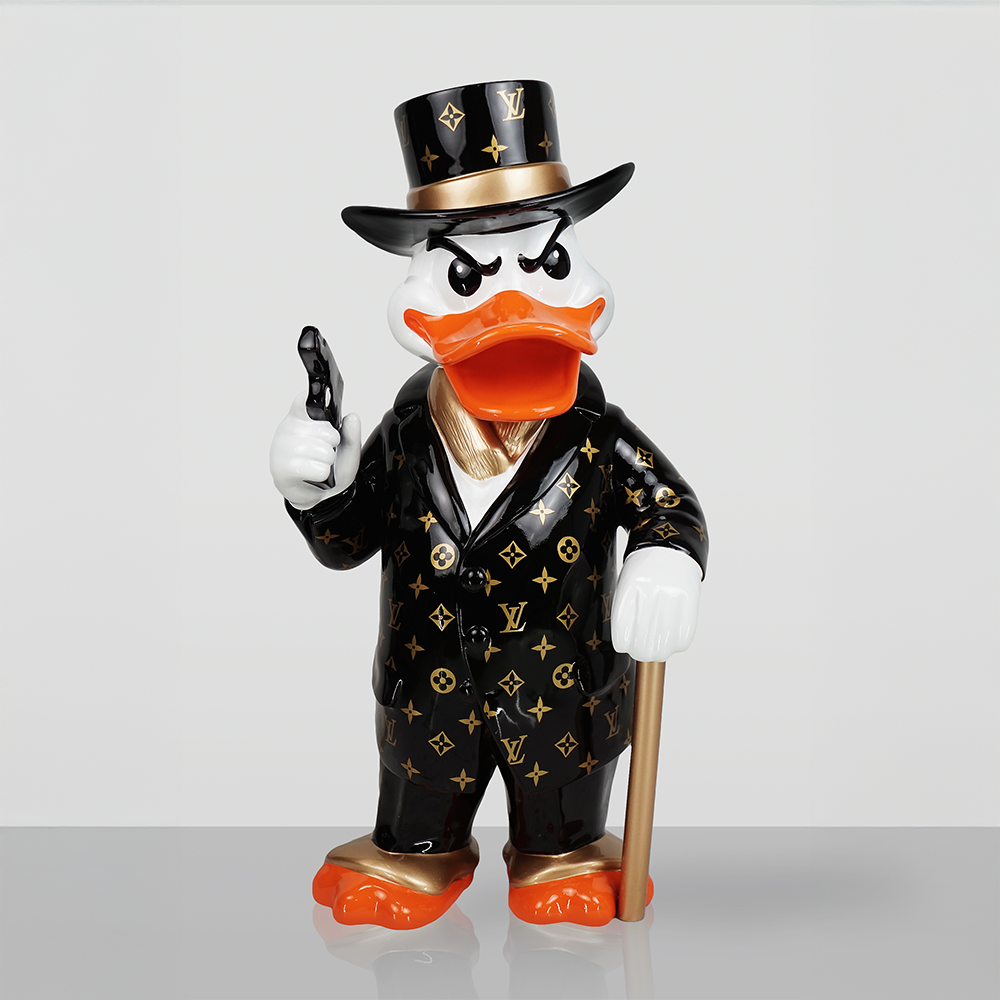 This unique decorative figurine depicts Al Capone Duck, styled after the famous 1920s gangster. Made from durable composite and PWS fiberglass laminate, it stands an impressive 120 cm tall, making it a striking addition to any space. With its solid construction and vivid details, such as the elegant black suit featuring a luxury brand motif and a hat, the figurine captures attention and adds character.